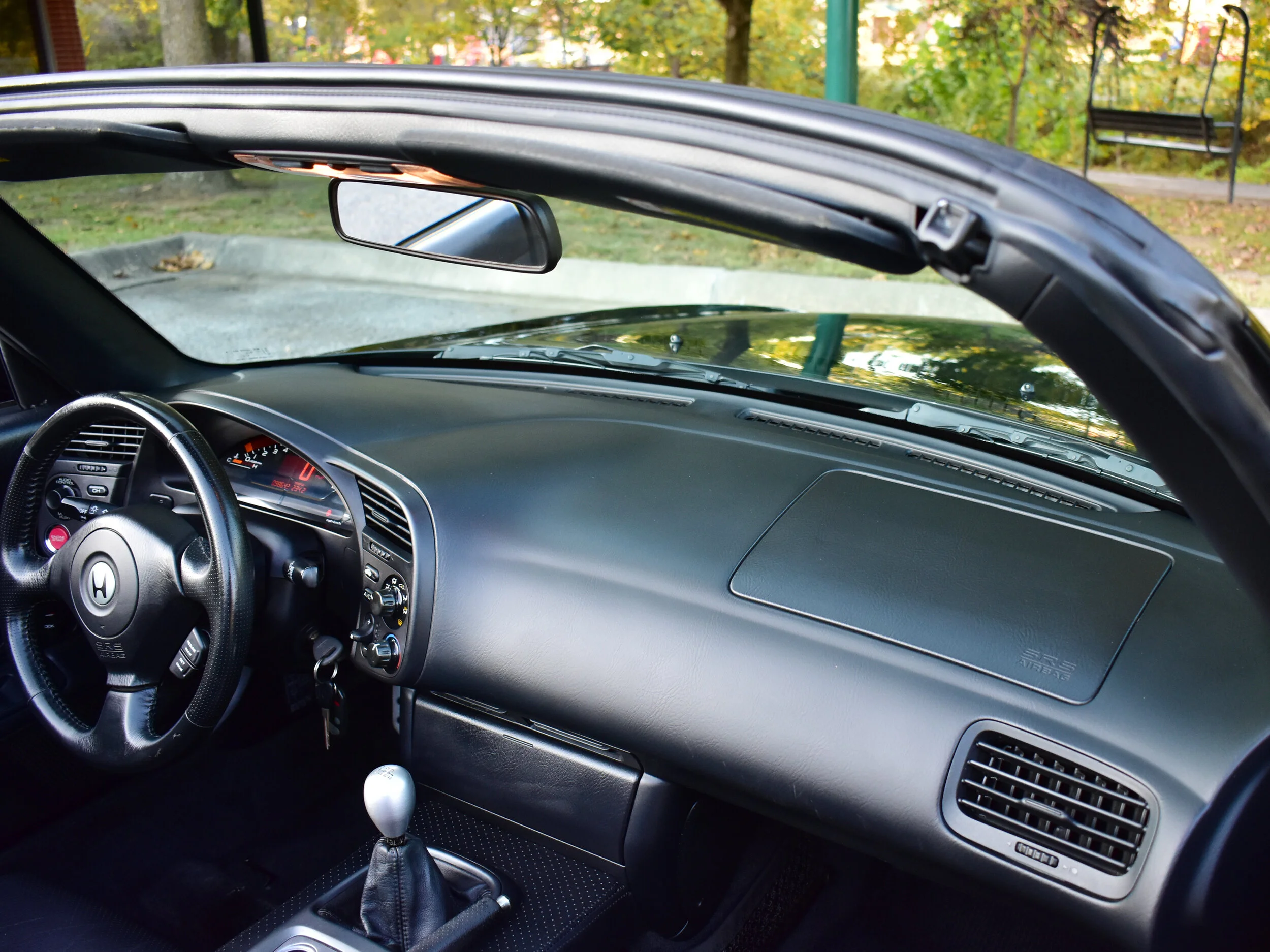 Inside the cabin is clean with only light wear. The black leather seats are in nice condition with some wear on the drivers side bolster. Honda S2000 standard equipment includes a digital gauge cluster, cruise control, Honda AM/FM/CD stereo, aluminum pedals, an aluminum shifter knob, power windows, power locks, and air conditioning. The convertible top is a power top.